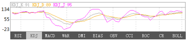 K线:当前K值为91;K线趋于平缓,K值大于80.位于超买区间。