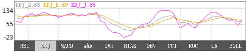 D线:当前D值为69;D线处于下降态势,它的变化滞后于K线和J线,但能帮助我们过滤掉偶然的虚假信号。