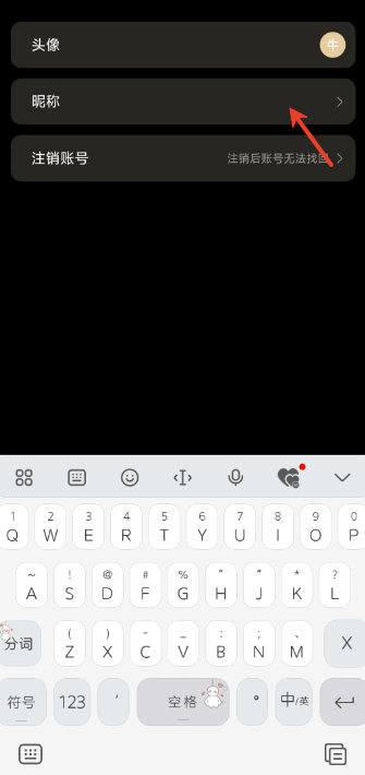 第三步:在个人信息页面点击昵称栏目,即可展开键盘栏