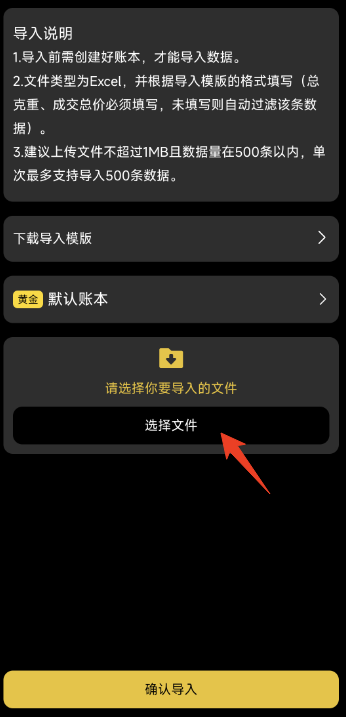 再次进入“导入数据”页面,点击“选择文件”,上传已经编辑好的账本文件