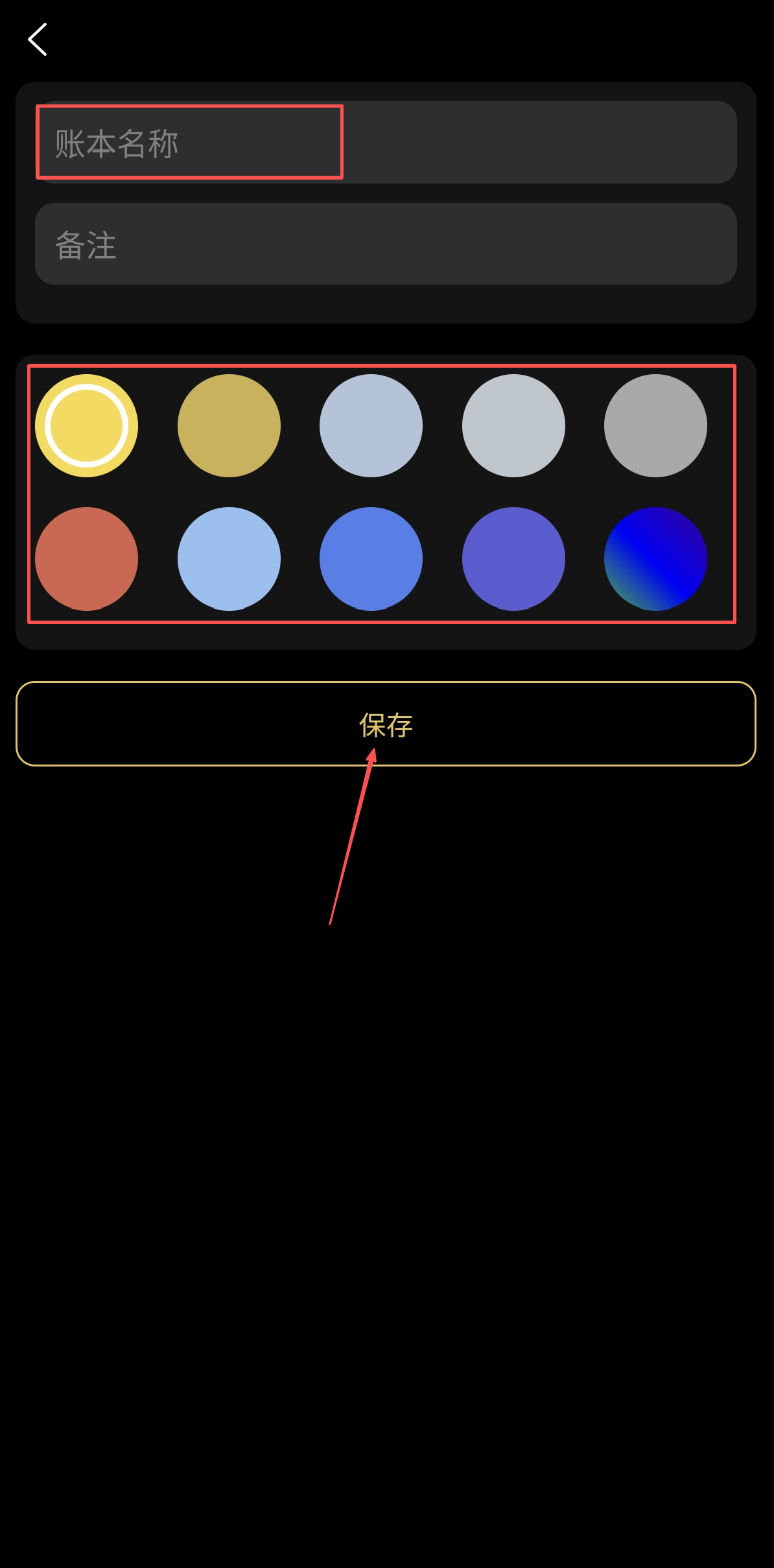 3.编辑账本名称-选择账本颜色-保存(新建完成后可修改账本名称和颜色)