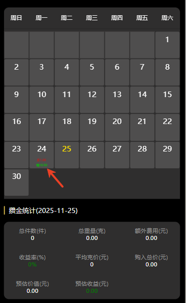 3.在攒金日历界面中,可以根据需要调整年、月进行查看