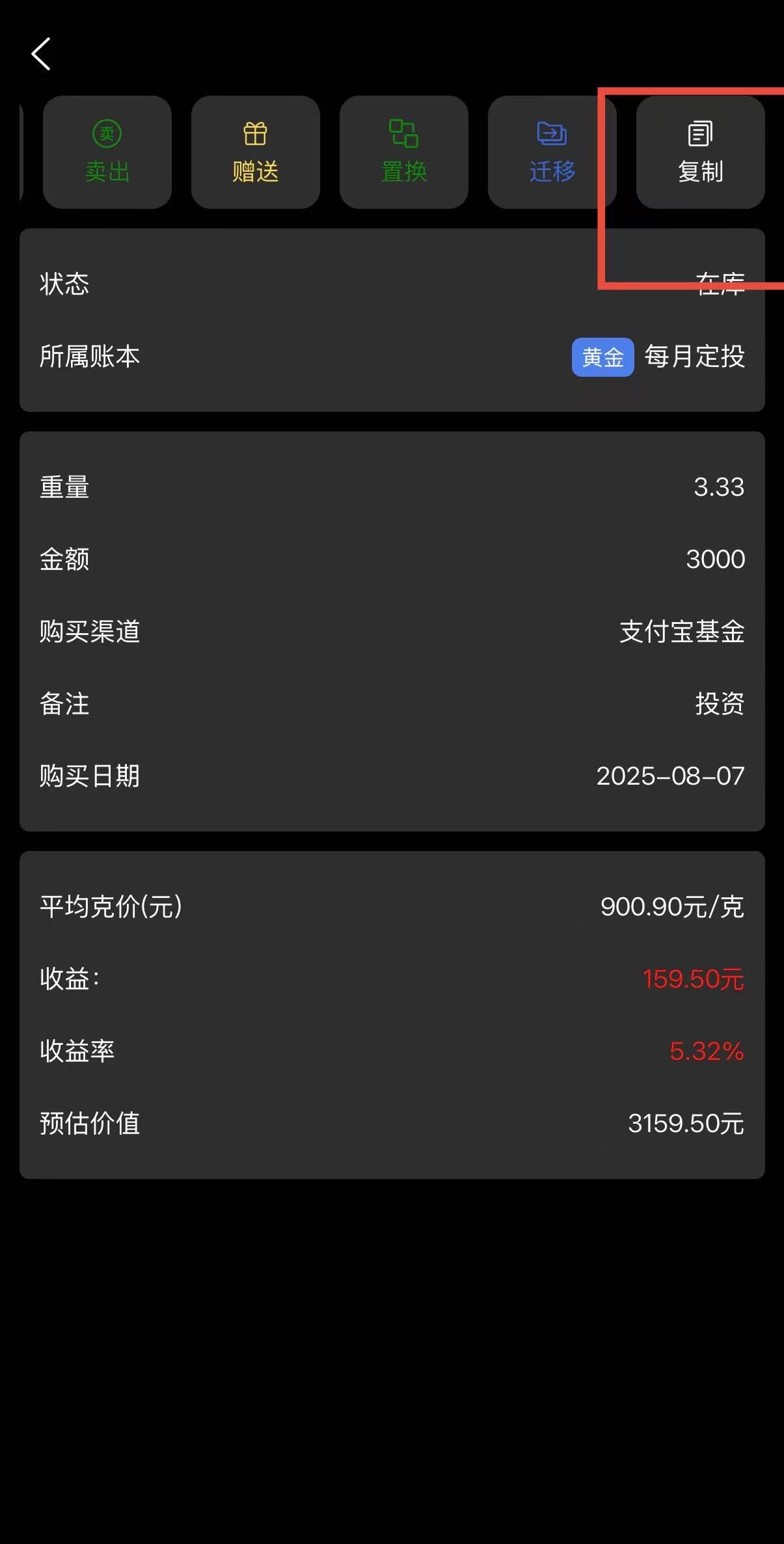 金价一指查解决你的烦恼!复制+迁移两大功能强强联合,直接把定投记账的效率拉满!你只需找到上个月的定投账本,点击复制按钮,就能一键复刻所有投资信息,简单修改交易时间后,再通过迁移功能,就能把这份完整的定投数据同步到任意其他账本中——不管是家庭联合账本、专项投资账本,还是备用记账本,都能实现数据无缝转移。