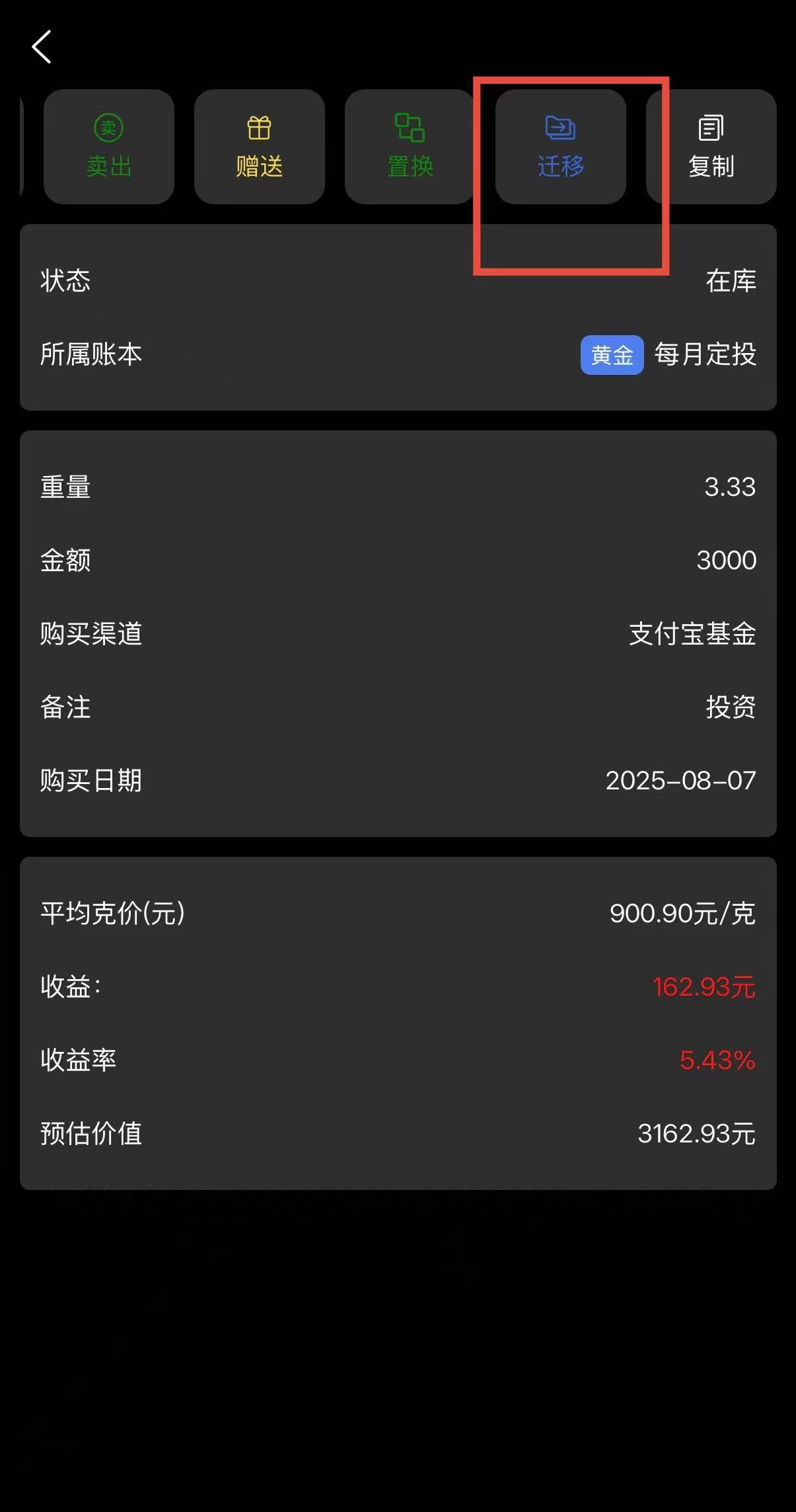 6.进入要迁移的投资中,点击状态栏上方的迁移。
