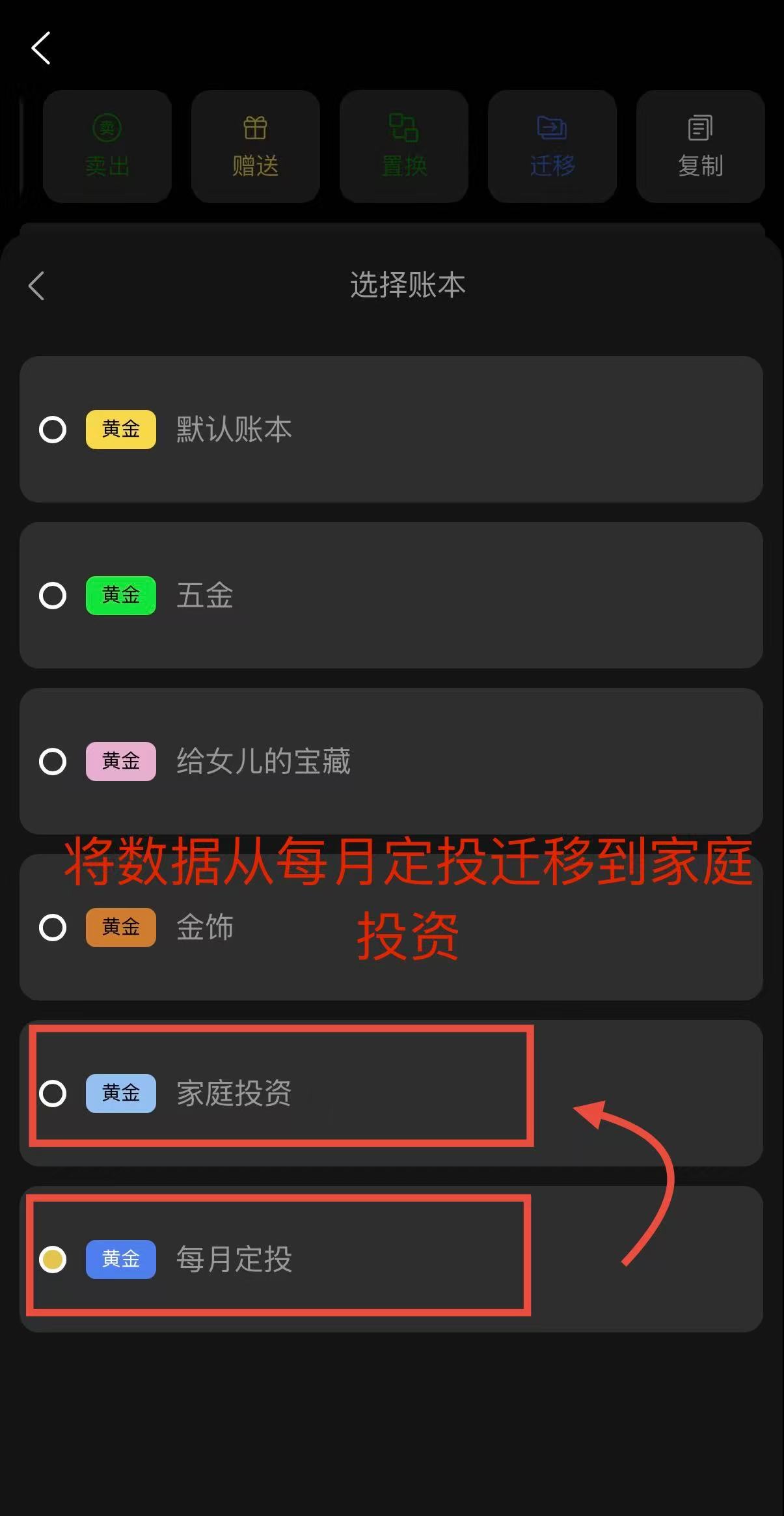 2.切换账本后选择需要复制与迁移的投资数据。