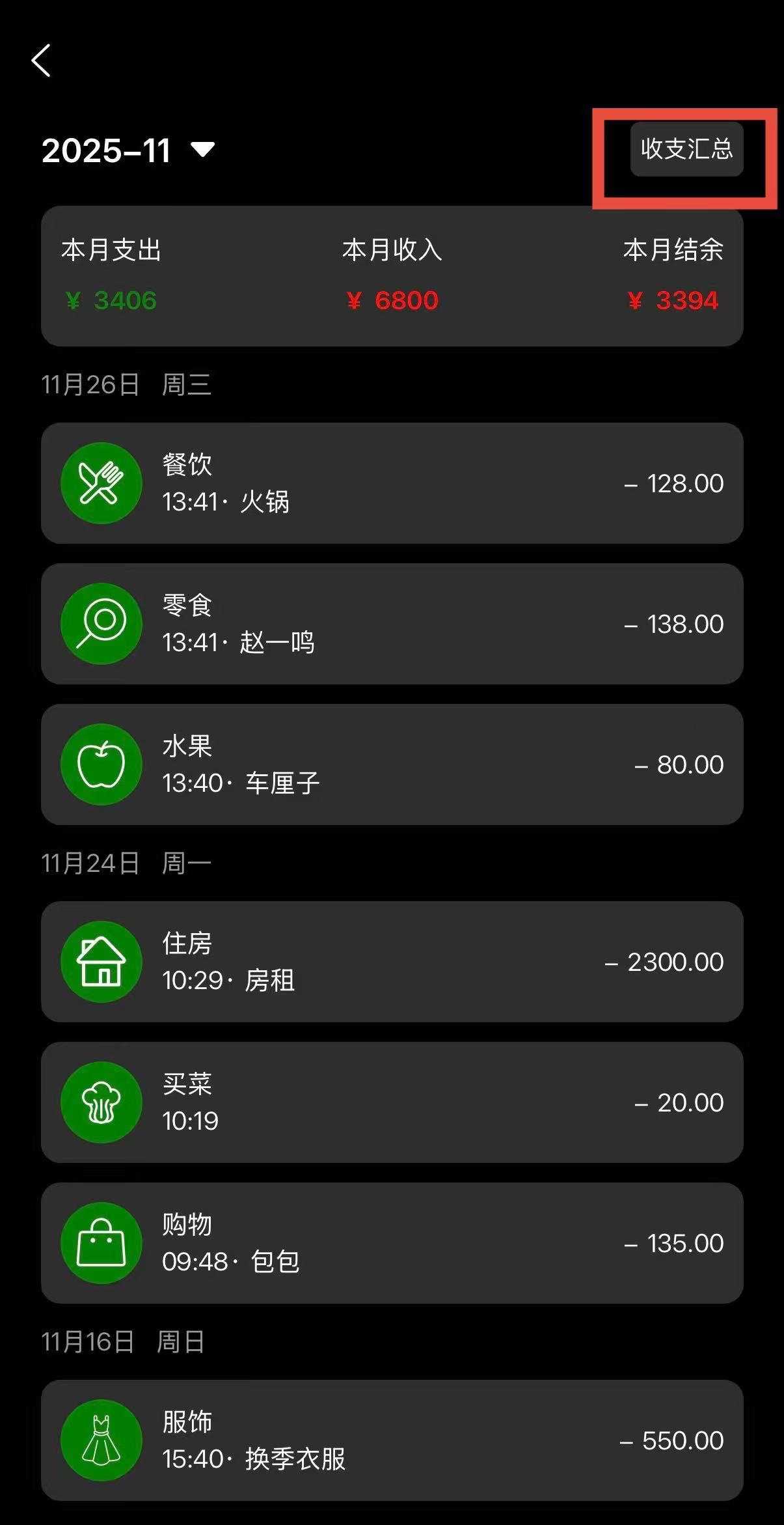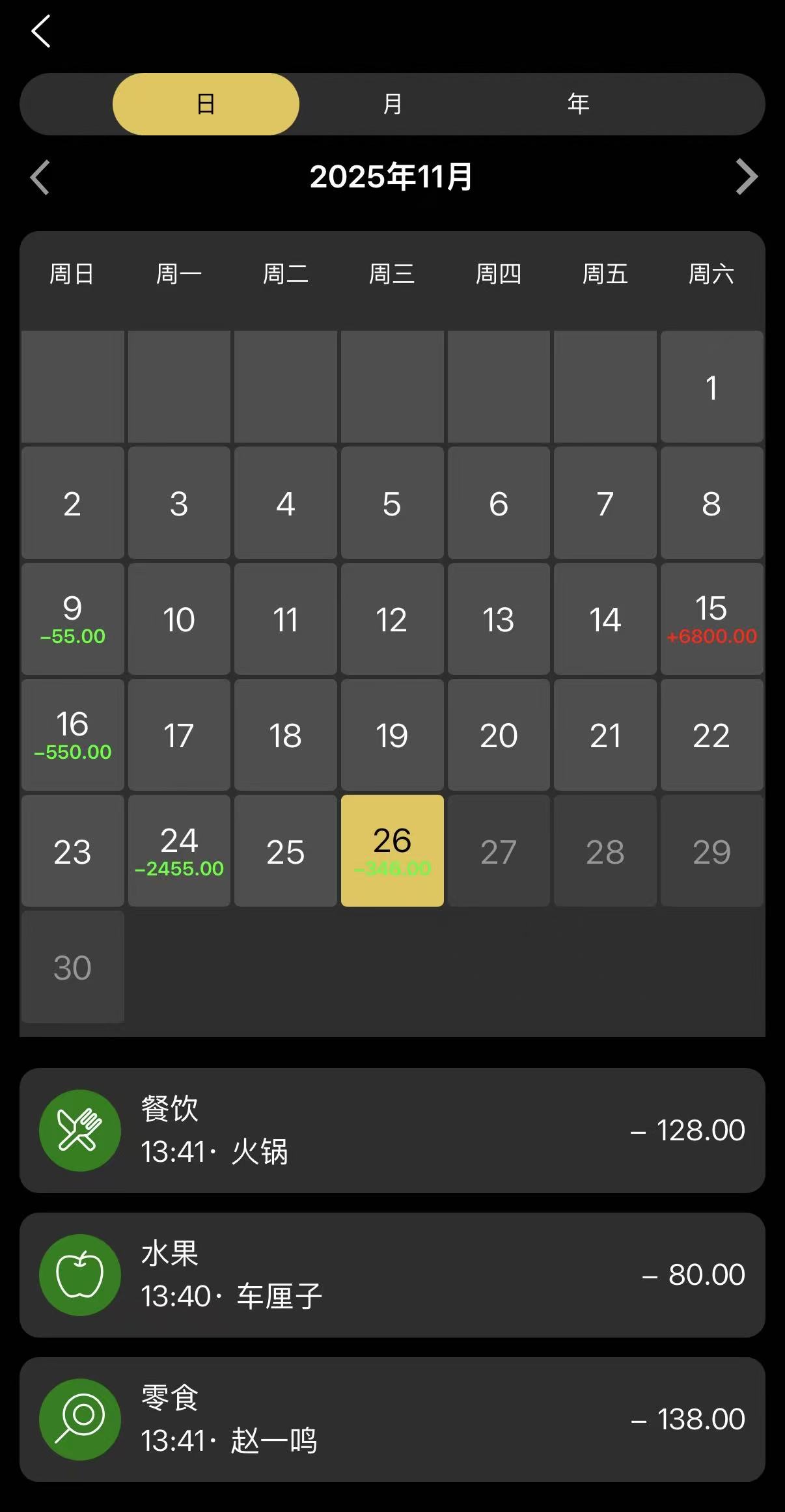 就拿11月的账单来说吧:打开软件直接切到“日视图”,当天吃了顿128的火锅、买了80块的车厘子、顺手囤了138的零食,每一笔消费明明白白列在下面,连几点花的钱都标得清清楚楚,再也不用对着银行卡短信猜“这500块到底花哪了”。