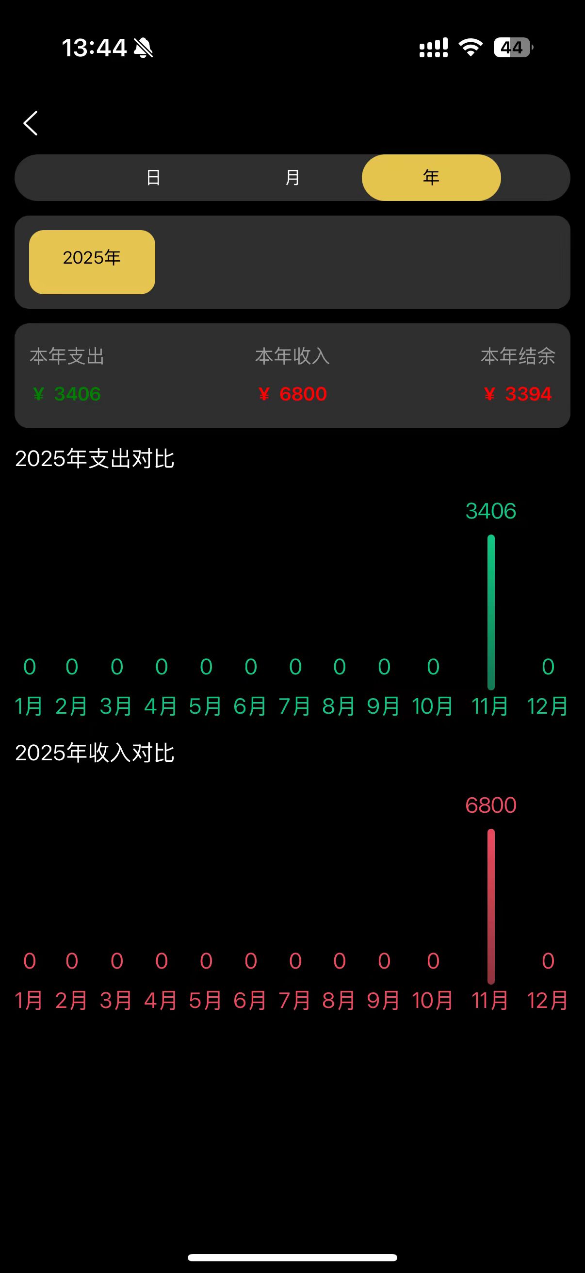 最惊喜的是“年视图”!点开直接看到全年收支走势:今年到目前为止收入6800、支出3406.结余3394.连每个月的收支变化都做成了直观的柱状图,哪个月花超了、哪个月攒得多,一眼就能看出来!