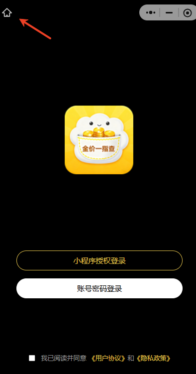 5.点击登录页面左上角 主页图标 返回主页。(未登录情况下仍可查看实时金价)